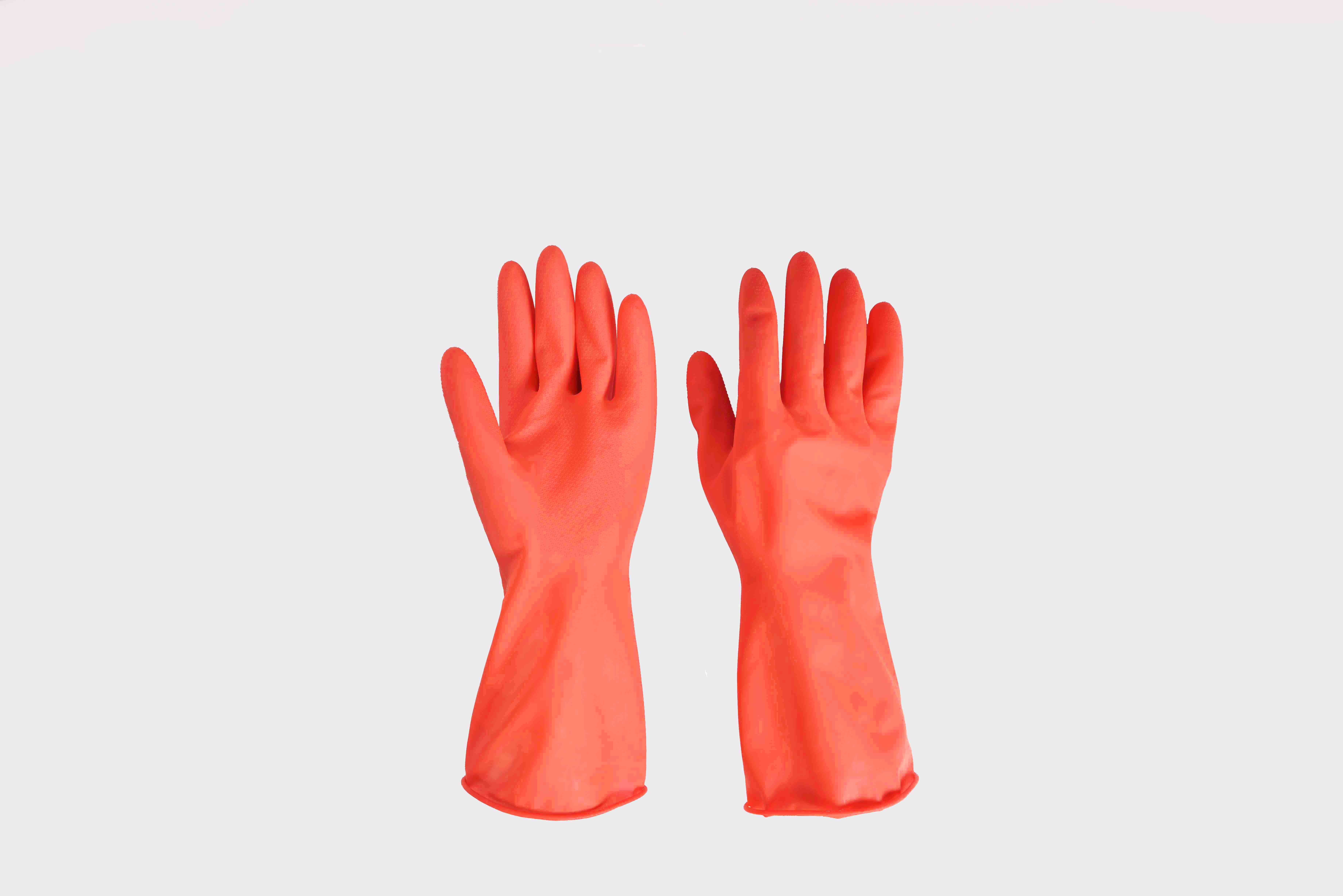 Sanitation glove, made of natrual latex, length 32-36cm, textured palm for anti-slip, waterproof, anti acid and alkali, non-toxic. Mainly used for food processing, hotels, family kitchen, etc. Color: red, yellow, orange, rose, nude, etc.